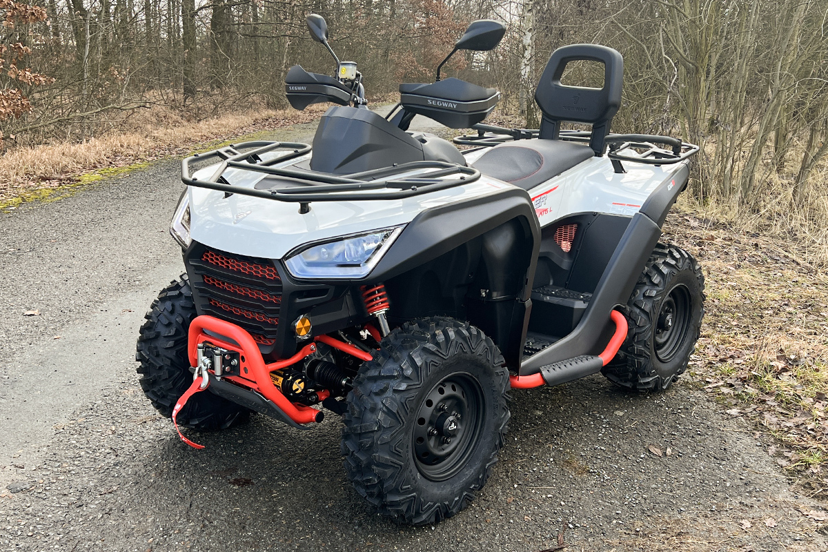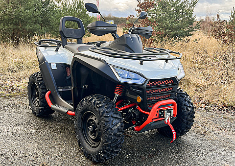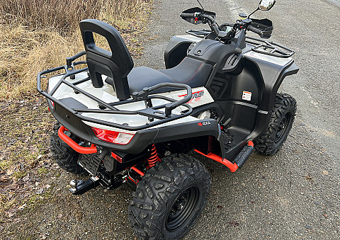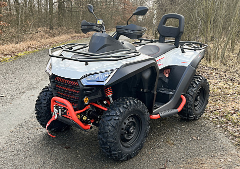 Užitková / pracovně-rekreační čtyřkolka, E5 - L7e, kapalinou chlazený jednoválec 570 cm3 EFI, automatická převodovka P/R/N/L/H, brzdění motorem, pohon 4x4 se dvěma uzamykatelnými diferenciály, dvojitá A-ramena vpředu / dvojitá A-ramena se stabilizátorem vzadu, hydraulické tlumiče s progresivními pružinami, přední, zadní a boční ochranné rámy, tažné zařízení, el. naviják 2500 lbs, kompozitní nosiče vpředu a vzadu, 12V zásuvka, 12" ocelové disky, ochranné kryty rukojetí